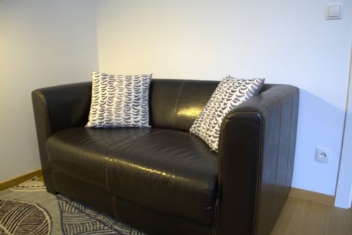 Der Praxisraum vermittelt eine moderne und zugleich gemütliche Atmosphäre, die einladend und beruhigend wirkt. Die warmen Orangetöne der beiden Sessel schaffen eine angenehme, freundliche Umgebung, ideal für offene Gespräche und kreative Zusammenarbeit.