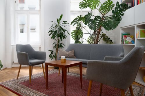 Zwei gemütliche Therapiestühle zur Gesprächsführung in angenehmer Atmosphäre.