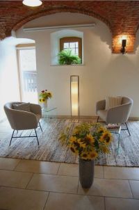Der Wartebereich ist ansprechend, mit Möglichkeit der Beschallung, ausreichend Sitzmöglichkeiten und Lektüren ausgestattet. Um die Ecke befindet sich ein Empfangsbereich mit Steinwasserbecken und kleiner Tee-/Kaffeeküche.