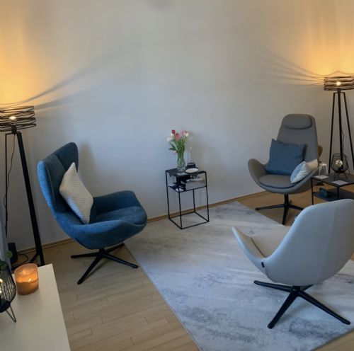 Der Praxisraum vermittelt eine moderne und zugleich gemütliche Atmosphäre, die einladend und beruhigend wirkt. Die warmen Orangetöne der beiden Sessel schaffen eine angenehme, freundliche Umgebung, ideal für offene Gespräche und kreative Zusammenarbeit.