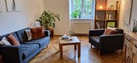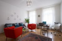 Der Praxisraum vermittelt eine moderne und zugleich gemütliche Atmosphäre, die einladend und beruhigend wirkt. Die warmen Orangetöne der beiden Sessel schaffen eine angenehme, freundliche Umgebung, ideal für offene Gespräche und kreative Zusammenarbeit.