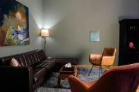 Der Praxisraum vermittelt eine moderne und zugleich gemütliche Atmosphäre, die einladend und beruhigend wirkt. Die warmen Orangetöne der beiden Sessel schaffen eine angenehme, freundliche Umgebung, ideal für offene Gespräche und kreative Zusammenarbeit.