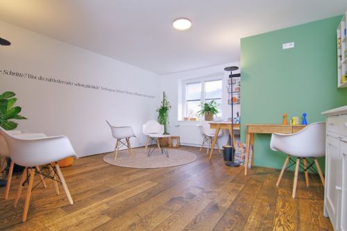 Der Praxisraum vermittelt eine moderne und zugleich gemütliche Atmosphäre, die einladend und beruhigend wirkt. Die warmen Orangetöne der beiden Sessel schaffen eine angenehme, freundliche Umgebung, ideal für offene Gespräche und kreative Zusammenarbeit.