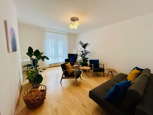 Praxisraum 1 ist mit Besprechungstisch, Liegecouch bzw. Sitzecke eingerichtet. Er eignet sich für Einzeltherapie, Paartherapie, Coaching, Training, Supervision und Kleingruppen bis zu 4-5 Personen.