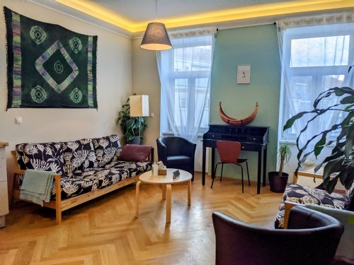 Der große Praxisraum bietet durch seine Größe von über 21qm und die Ausstattung mit unterschiedlichen Arbeits- und Therapieutensilien vielseitige Möglichkeiten therapeutischer Arbeit (Psychotherapie Einzelsetting, Paartherapie, Körperarbeit, Kleingruppen).