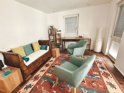 Blick in den freundlichen, lichtdurchfluteten Praxisraum mit gemütlicher Sitzecke.