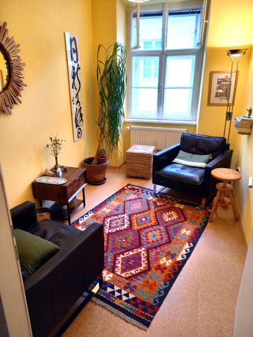Der große Praxisraum bietet durch seine Größe von über 21qm und die Ausstattung mit unterschiedlichen Arbeits- und Therapieutensilien vielseitige Möglichkeiten therapeutischer Arbeit (Psychotherapie Einzelsetting, Paartherapie, Körperarbeit, Kleingruppen).