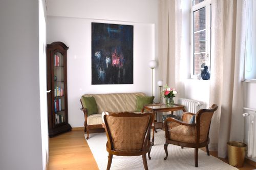 Praxisraum 1 ist mit Besprechungstisch, Liegecouch bzw. Sitzecke eingerichtet. Er eignet sich für Einzeltherapie, Paartherapie, Coaching, Training, Supervision und Kleingruppen bis zu 4-5 Personen.