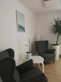 Im hellen Praxisraum laden bequeme Sitzgelegenheiten ein, sich zu entspannen.