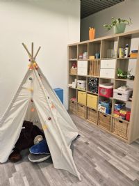 Hier sieht man das Spielzelt für die Kindertherapie mit den 'Therapiegehilfen' Bär Paul, Wal Klara und Igel 'Iglu'. Im Regal findet sich Material für das Arbeiten mit kreativen Medien und jede Menge Spielzeug für die Kindertherapie.