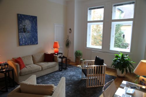 Gesamtansicht der Sitzgruppe im Praxisraum von Dr. Stephan Hametner. Der Raum kann verschieden ausgeleuchtet werden, der Blick durchs Fenster geht in einen wunderbaren Garten in Innenstadtlage. Das Setting ist je nach Bedarf veränderbar. Direkt vom Praxisraum aus kann ein separates WC besucht werden