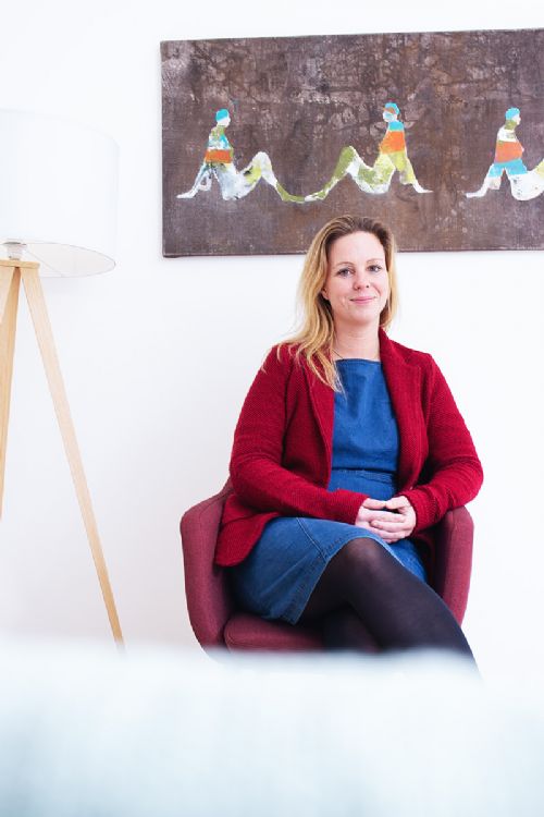 Der Praxisraum vermittelt eine moderne und zugleich gemütliche Atmosphäre, die einladend und beruhigend wirkt. Die warmen Orangetöne der beiden Sessel schaffen eine angenehme, freundliche Umgebung, ideal für offene Gespräche und kreative Zusammenarbeit.