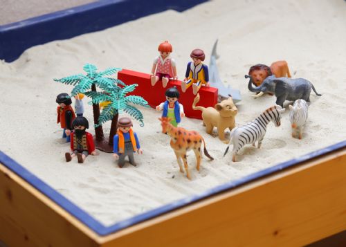 Hier sieht man das Spielzelt für die Kindertherapie mit den 'Therapiegehilfen' Bär Paul, Wal Klara und Igel 'Iglu'. Im Regal findet sich Material für das Arbeiten mit kreativen Medien und jede Menge Spielzeug für die Kindertherapie.