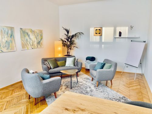 Der Praxisraum vermittelt eine moderne und zugleich gemütliche Atmosphäre, die einladend und beruhigend wirkt. Die warmen Orangetöne der beiden Sessel schaffen eine angenehme, freundliche Umgebung, ideal für offene Gespräche und kreative Zusammenarbeit.