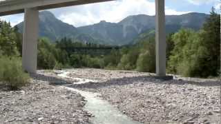 Von der neuen, wabenförmigen Holzbrücke über den Großen Suchagraben kann man faszinierende Ausblicke genießen: Zur einen Seite auf die Zikkurat-Drauwelle, zur anderen Seite in Richtung der majestätischen Karawanken und des Kraftwerks Rosegg-St. Jakob.